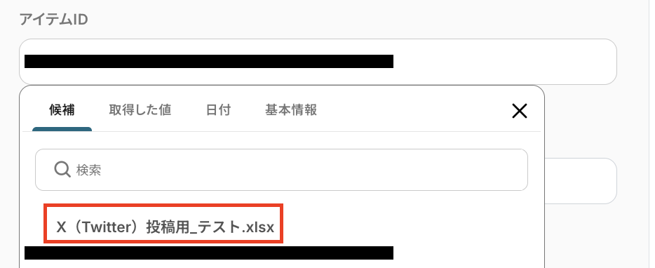 ・アイテムID:クリックし、候補から書類発行したいエクセルを選択します。