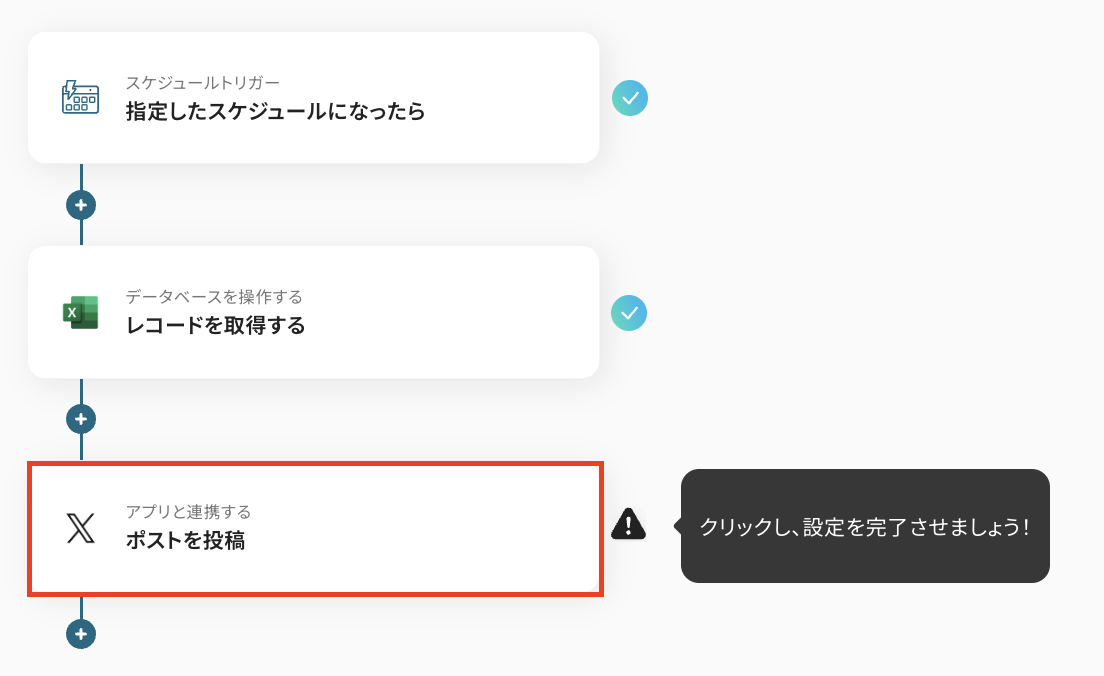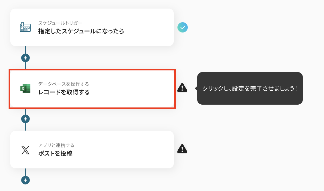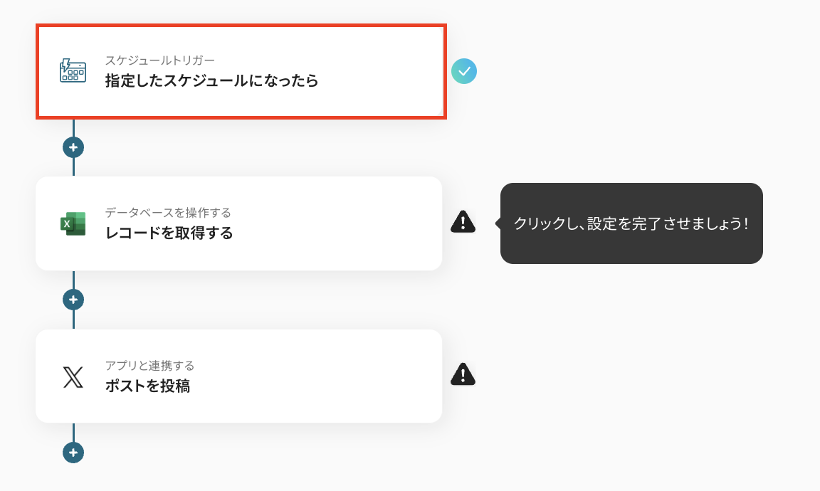 ここでは、Microsoft Excelからレコード情報を取得し、X(Twitter)にポストを投稿するスケジュールを指定します。