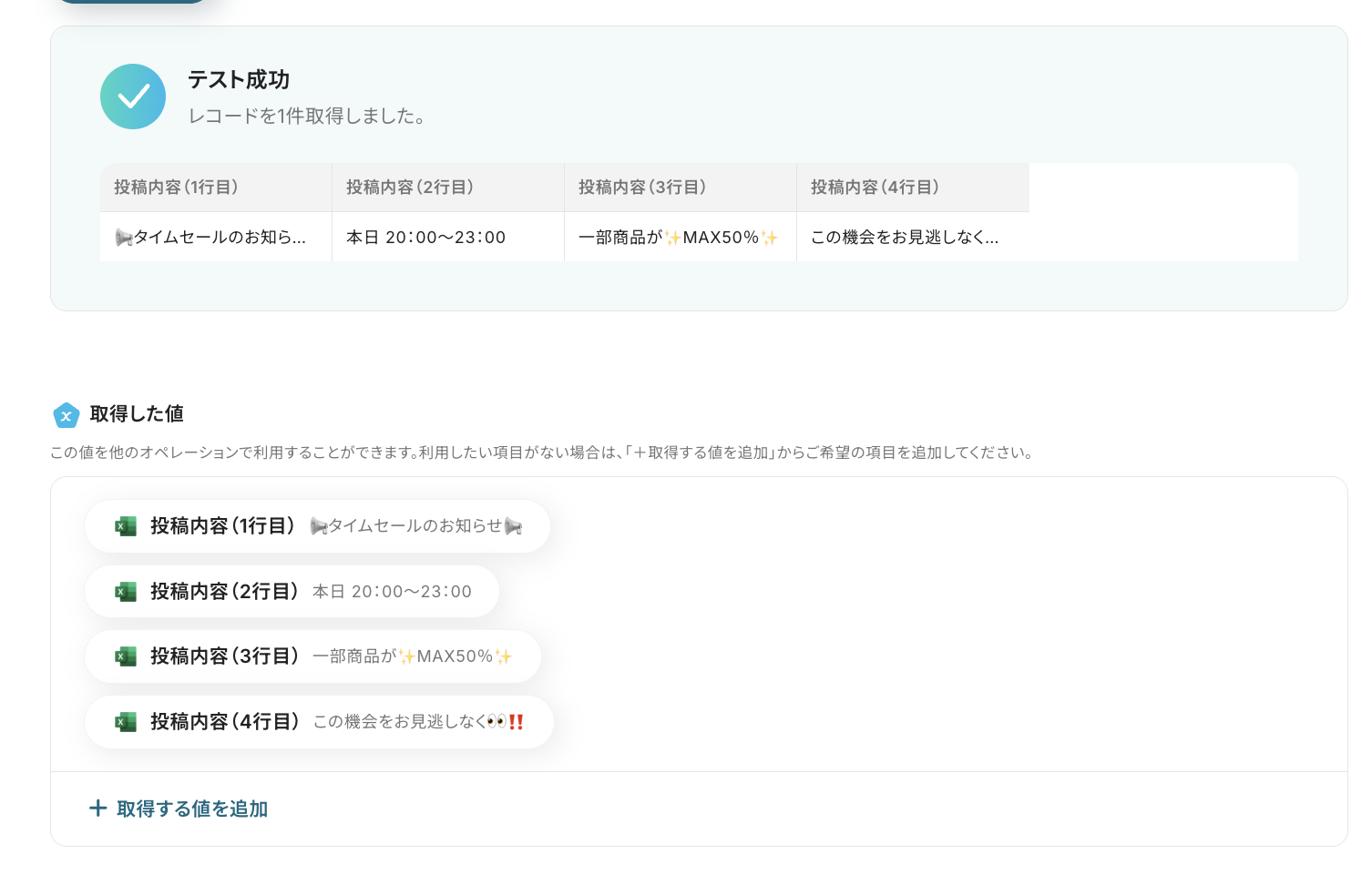 テストが成功すると、レコードの情報が「取得した値」にアウトプットとして抽出されるので、内容を確認してくださいね!