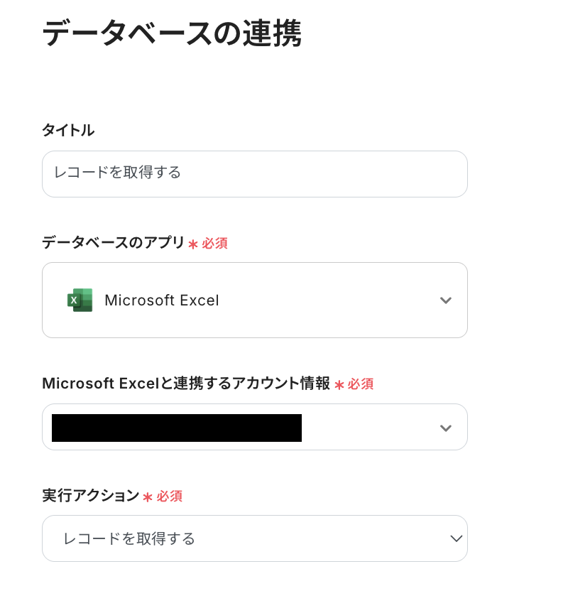 次に、Microsoft Excelのレコード情報を取得する設定を行います。