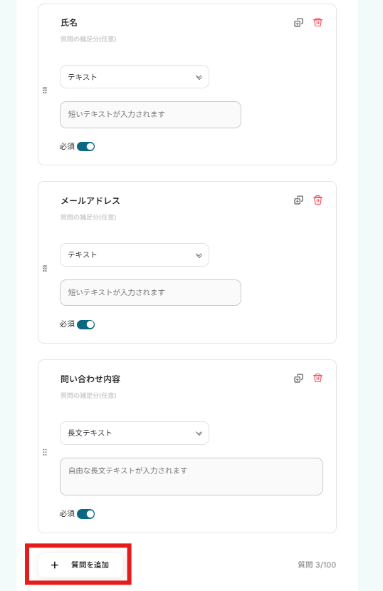 今回はデフォルトで「氏名」「メールアドレス」「お問い合わせ内容」が入力できるフォームとなっています。