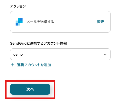 アクションはデフォルト設定のまま、アカウント情報は、連携したいアカウントが選択されているか確認してください。