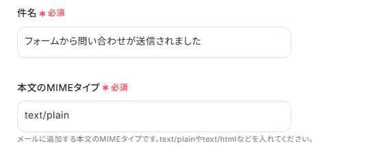 本文のMIMEタイプは、今回は装飾のないプレーンなテキストメールなので「text/plain」としています。
