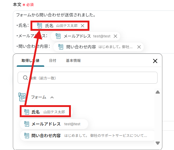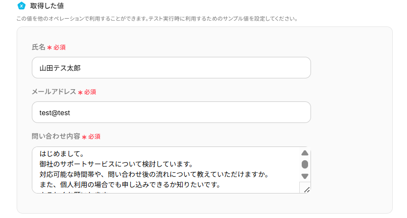 - 問い合わせ内容:取得した値より「問い合わせ内容」