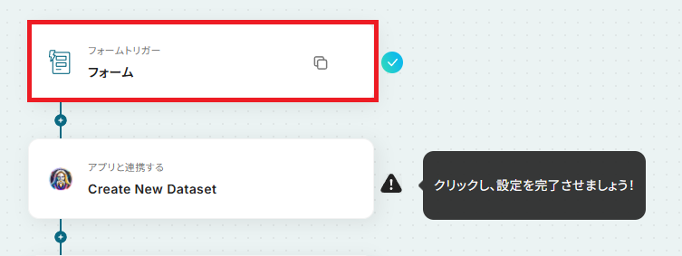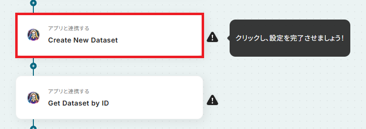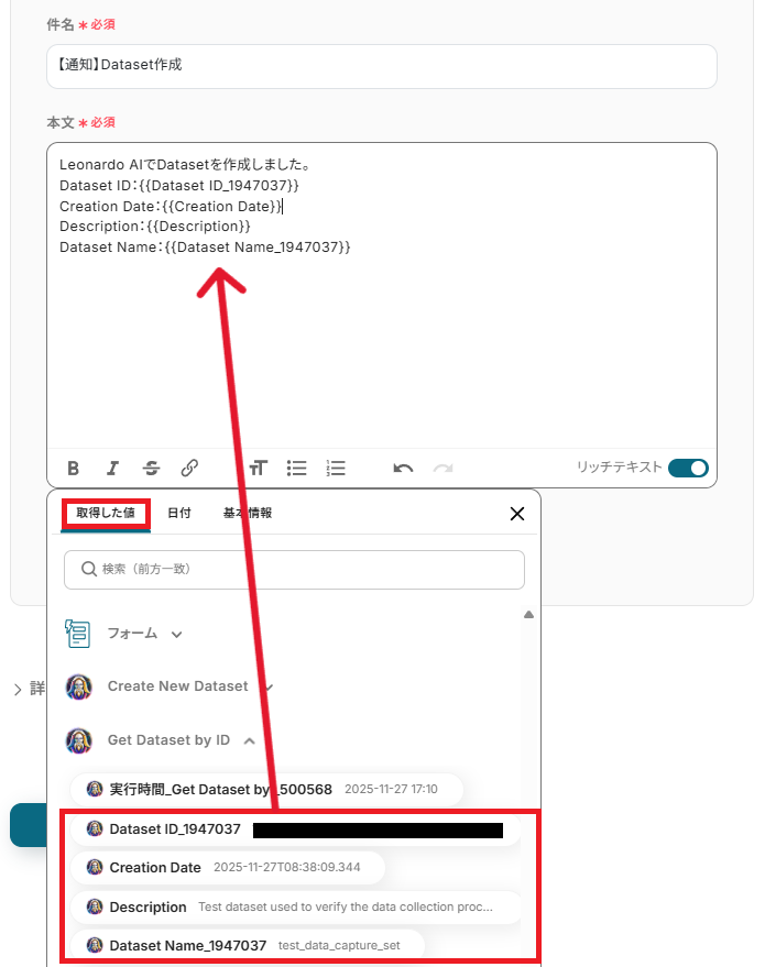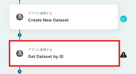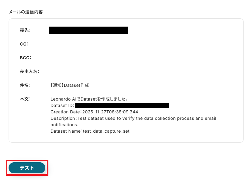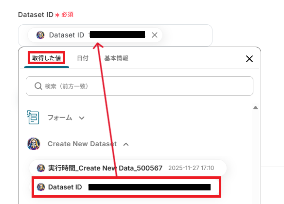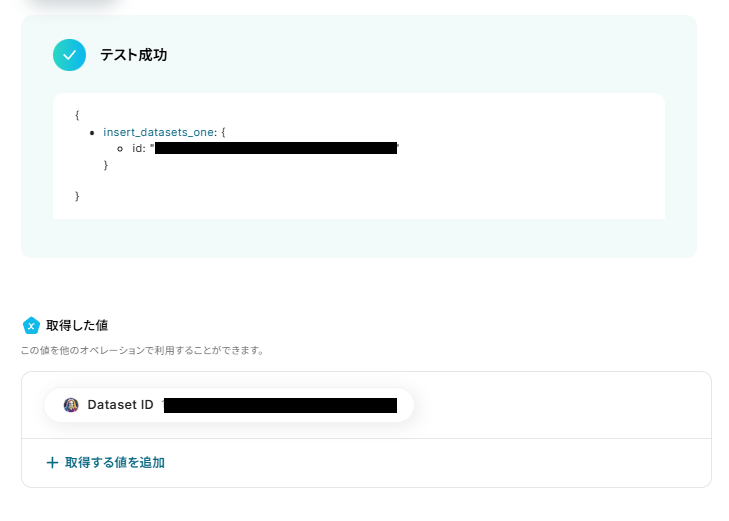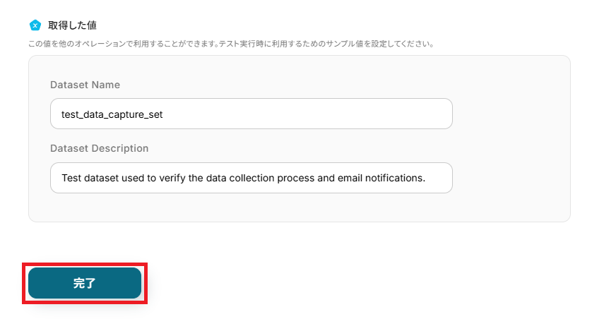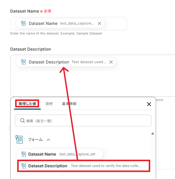 「Dataset Name」と「Dataset Description」は、取得した値を引用しフォームの値を設定しましょう。 ※取得した値とは? 取得した値を活用することで、固定値ではなく、トリガーが実行されるたびに最新の情報が反映できます。 設定が完了したら「テスト」を押してください。