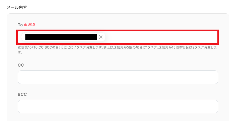 「To」は、任意のメールアドレスを設定してください。 なお、最後にメール送信のテストを行うので、実際にメールを受け取れるアドレスを設定しましょう。 「CC」「BCC」も任意で設定できます。