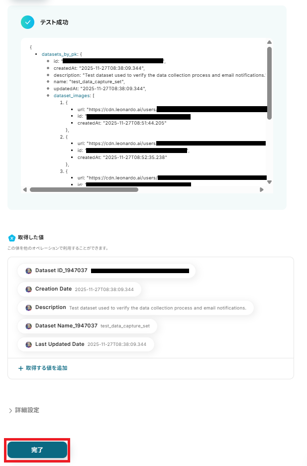 また実際にDatasetが作成されるので、Leonardo AIを確認してみましょう。 確認できたらYoomに戻り「完了」を押してください。
