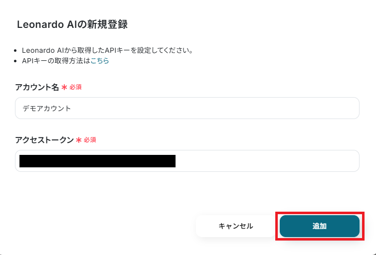 以下の画面が表示されます。 「アカウント名」:任意で管理用名称を設定 「アクセストークン」:APIの取得方法 を確認 全ての設定が完了したら「追加」をクリックしましょう。