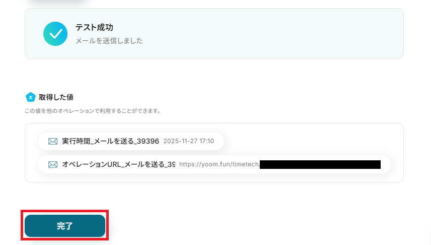 「フォームの表示設定と取得した値の設定」が表示されます。 取得した値に【テストで使用する値】を入力しましょう。 入力する値は、架空の情報(「テスト用」や「デモデータ」など)でOKです。 最後に「完了」を押してください。