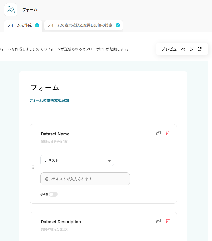 フォームは元から設定されており【Dataset Name】と【Dataset Description】が送信できるようになっています。 なお、フォームを変更またはカスタマイズしたい場合はフォームの基本設定・オプション設定について をご確認ください。