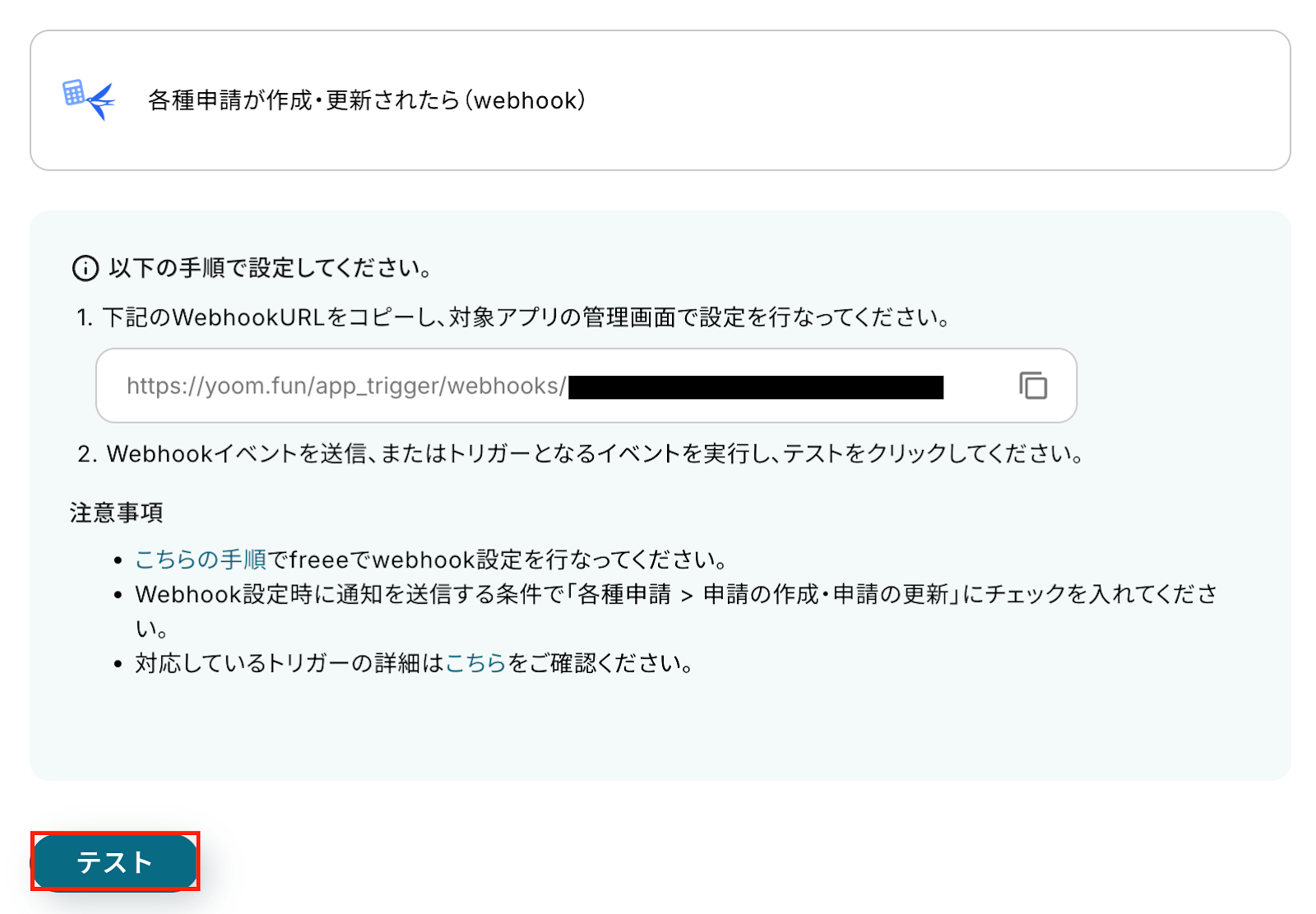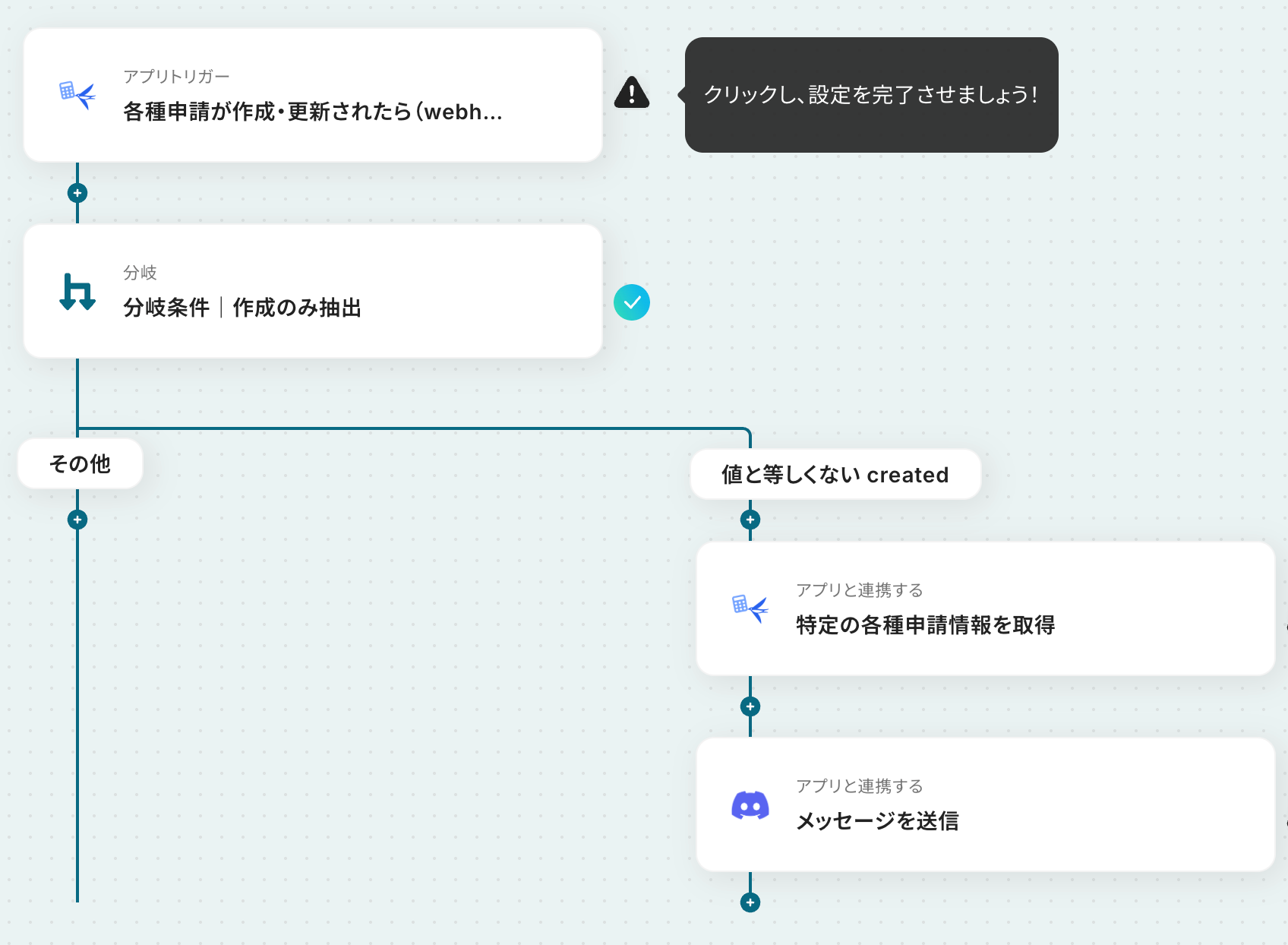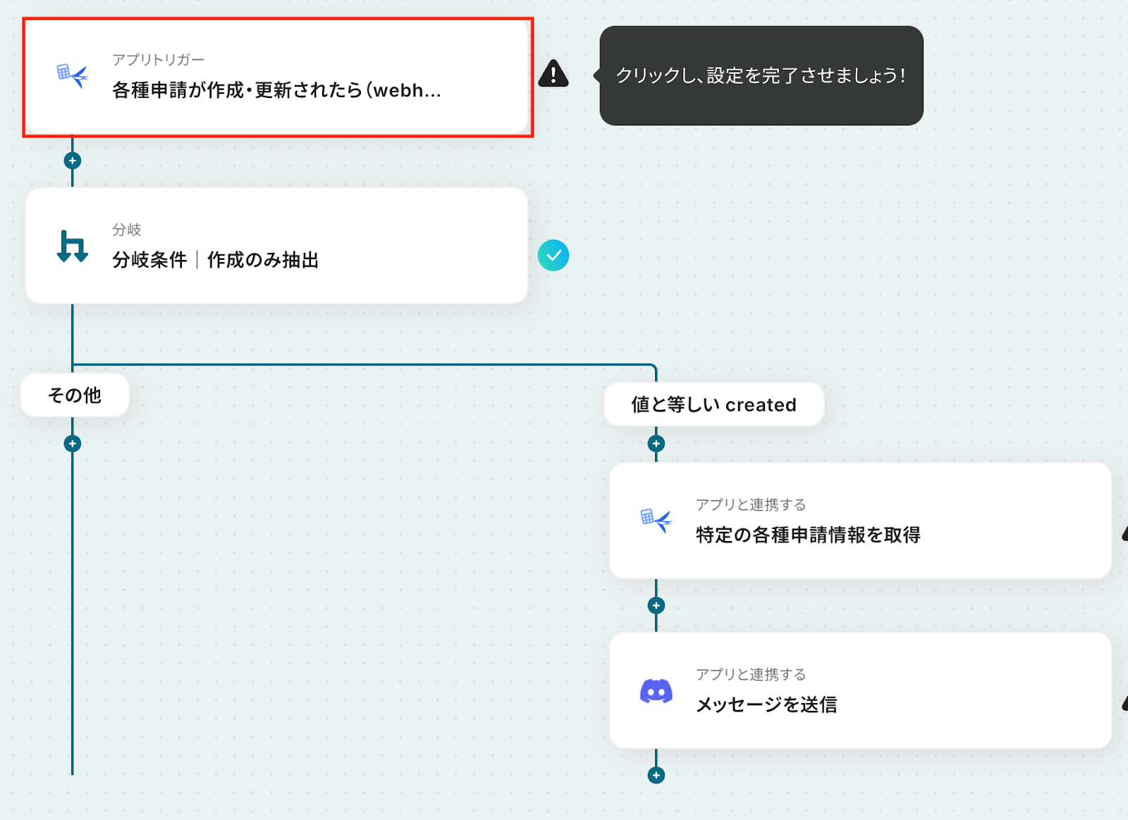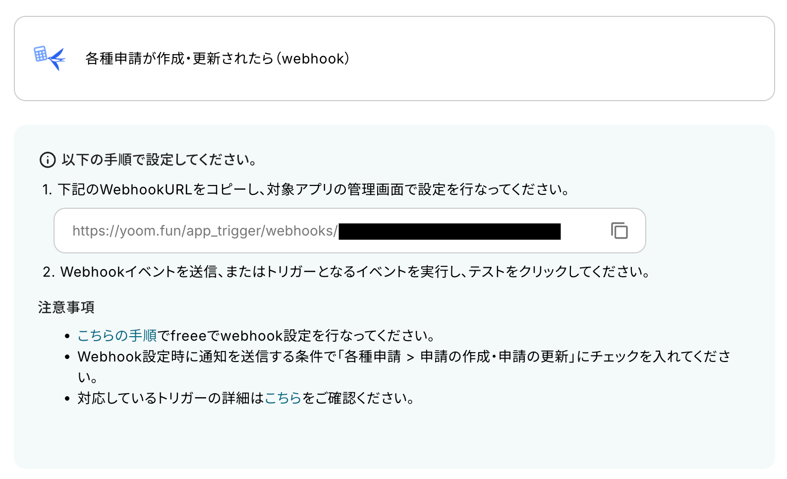 「各種申請が作成・更新されたら(webhook)」が選択されているので確認してください。