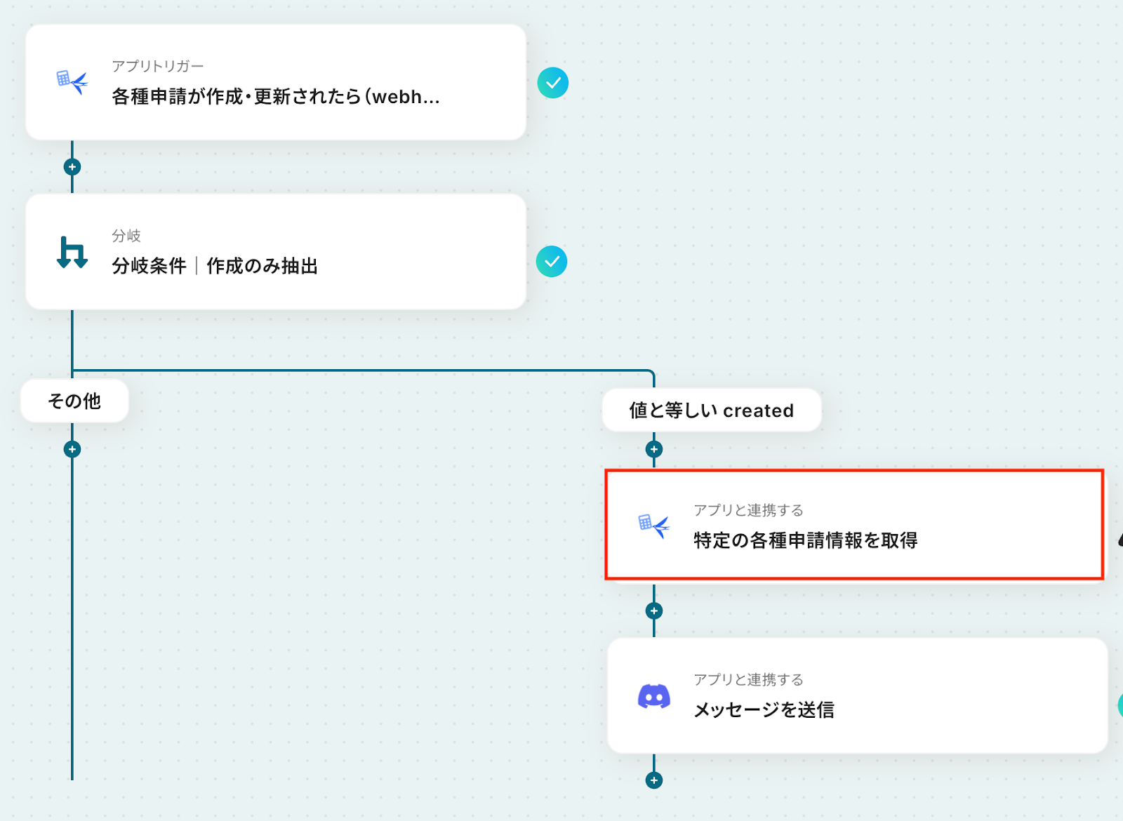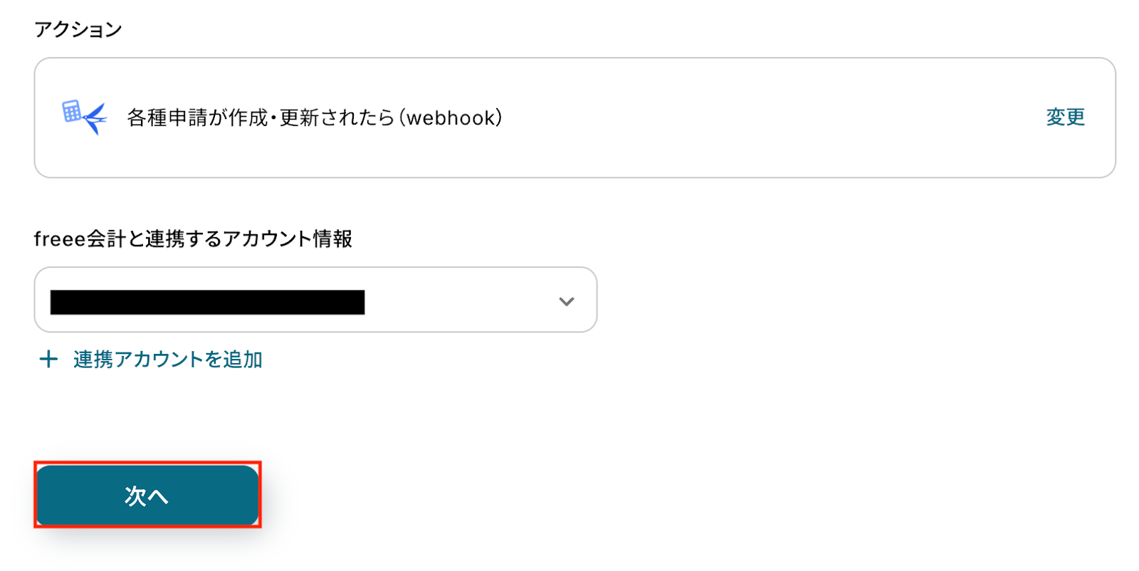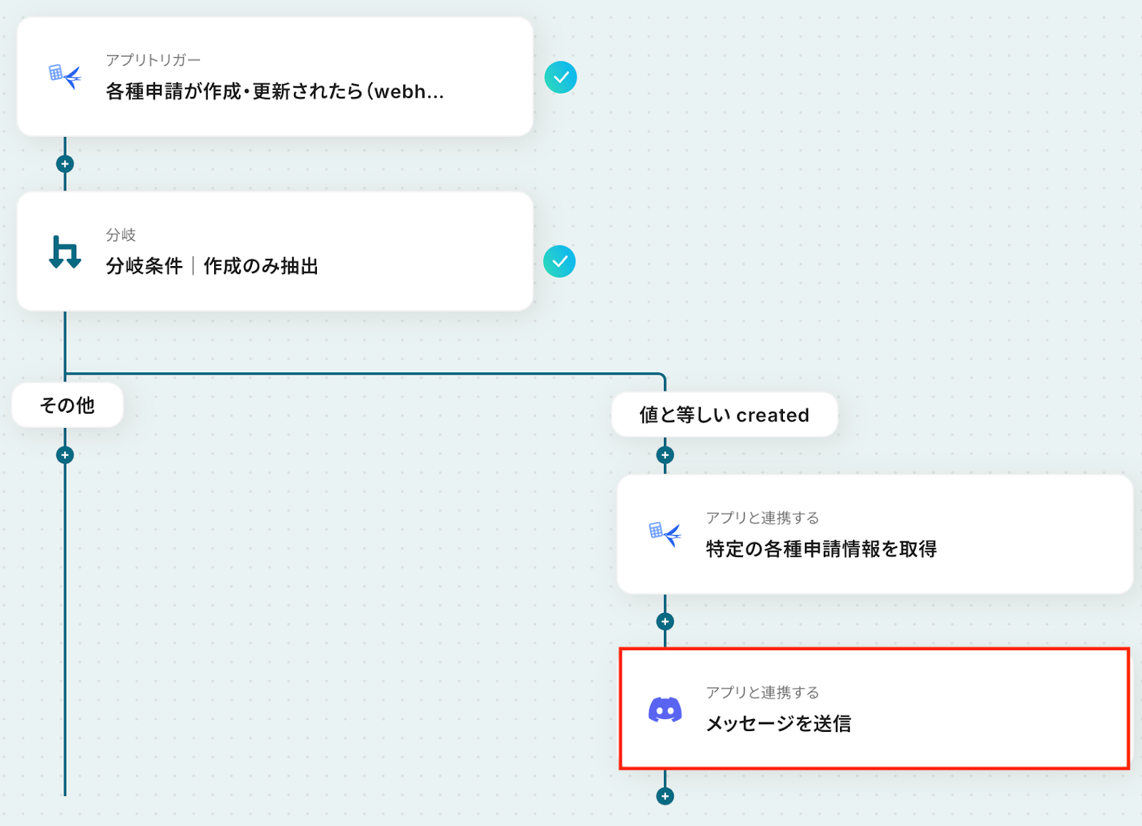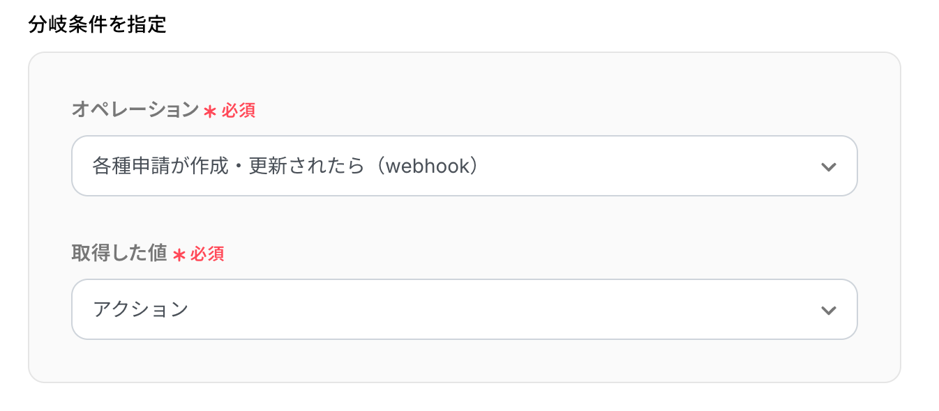 「各種申請が作成・更新されたら(webhook)」が選択されているので確認してください。