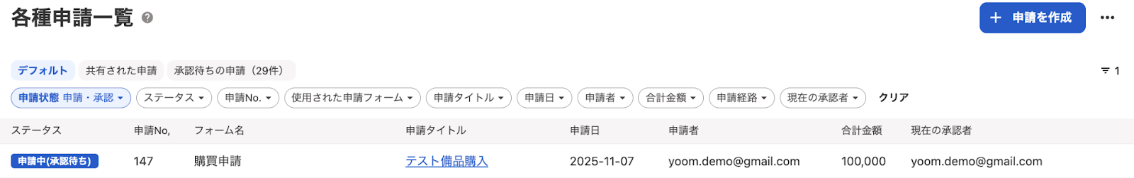 テストに成功すると、freee会計に作成された各種申請に関する情報が一覧で表示されます。