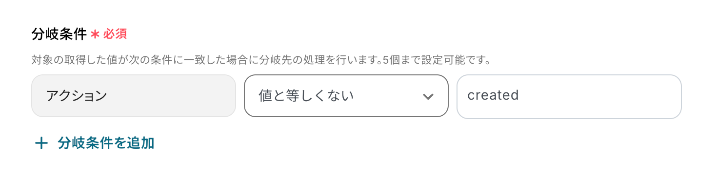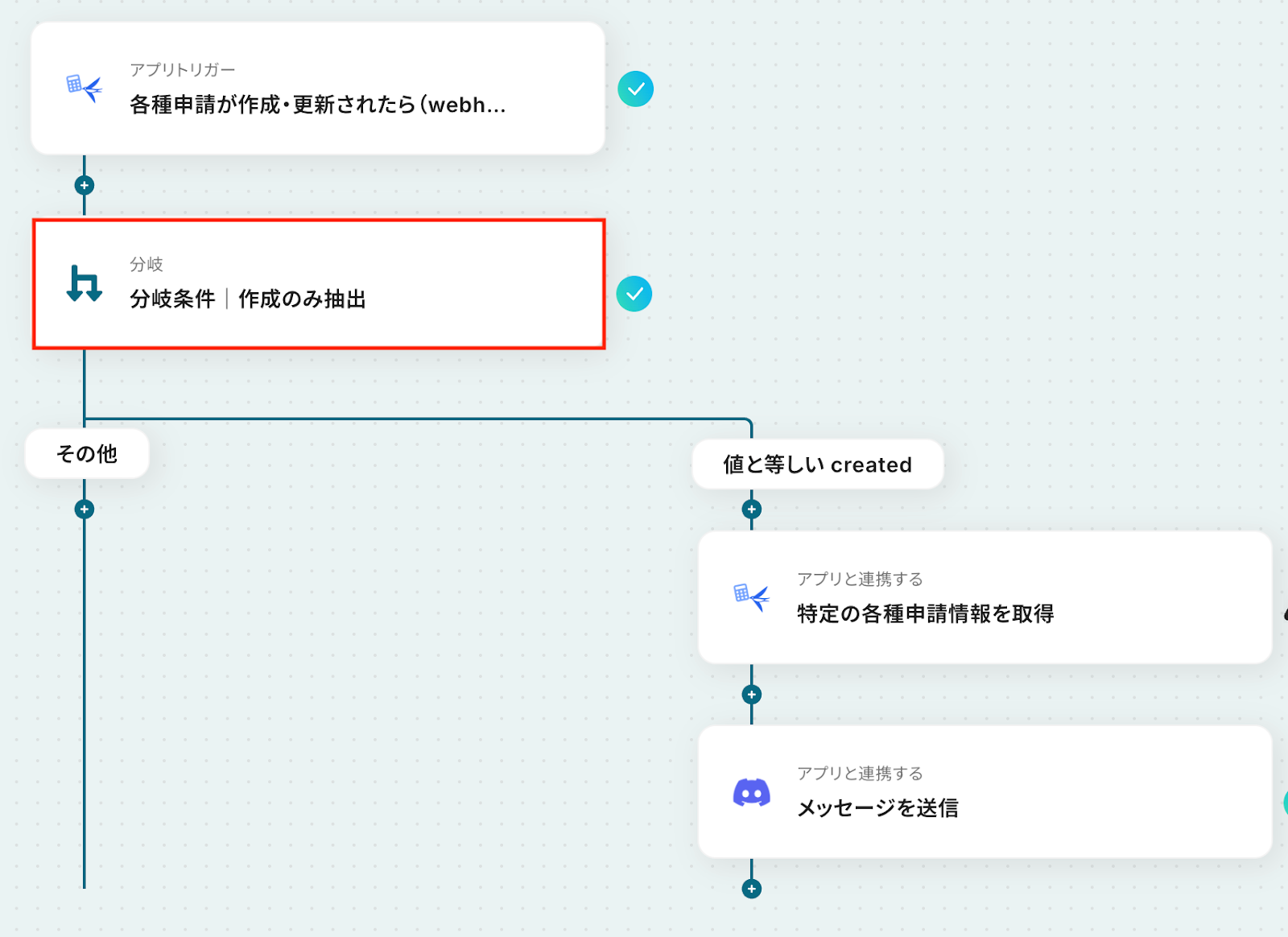 続いて、freee会計で各種申請が新たに作成された場合にのみフローを起動するよう、分岐の設定を行いましょう。