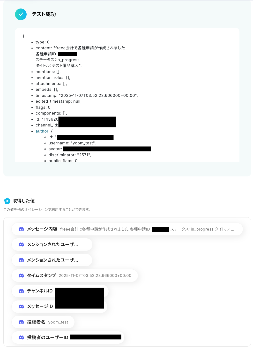 以下の画像の取得した値を利用し、この後のステップでDiscordにてメッセージの送信が可能です。