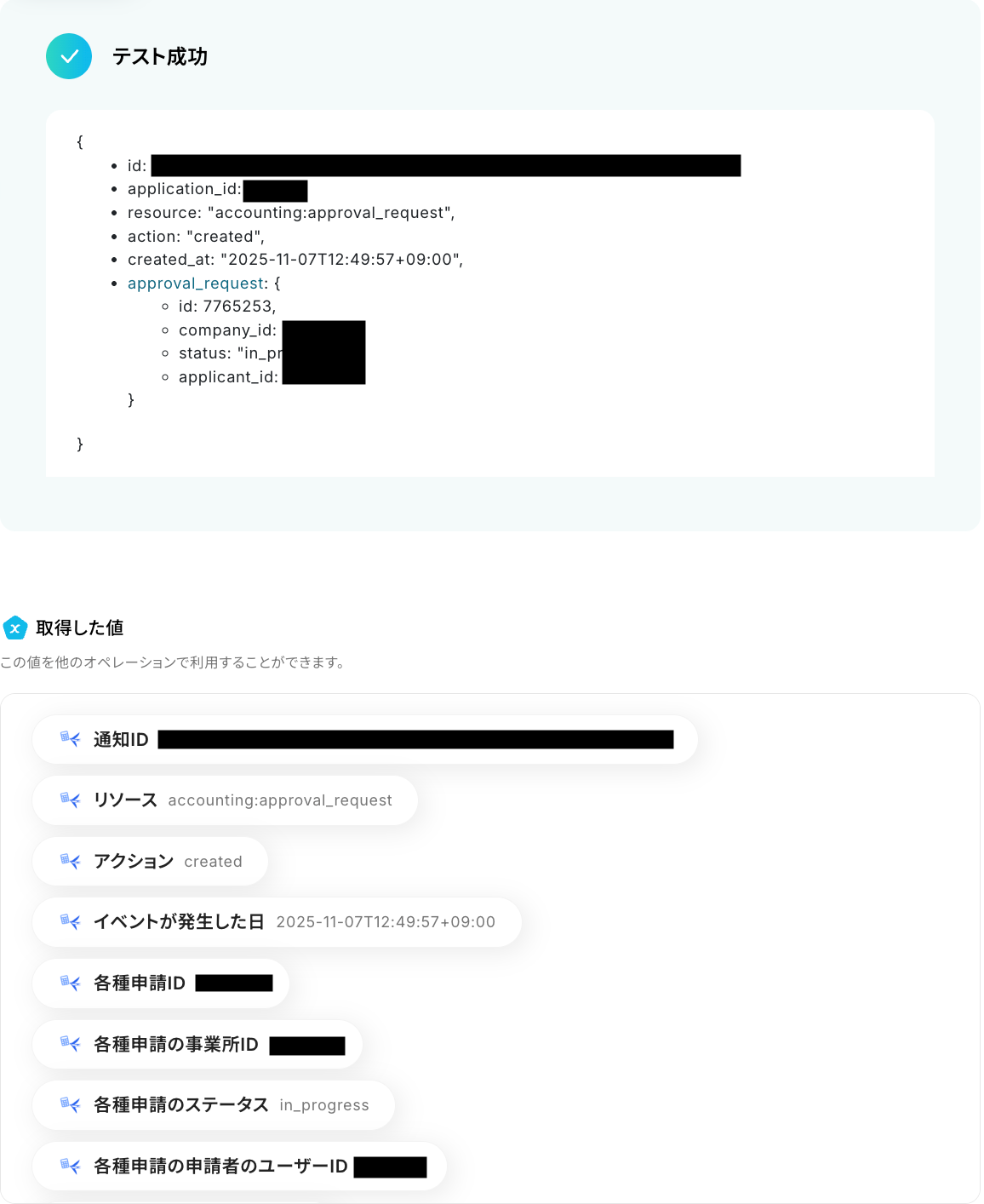 テストに成功すると、freee会計に作成された各種申請情報の詳細情報が一覧で表示されます。