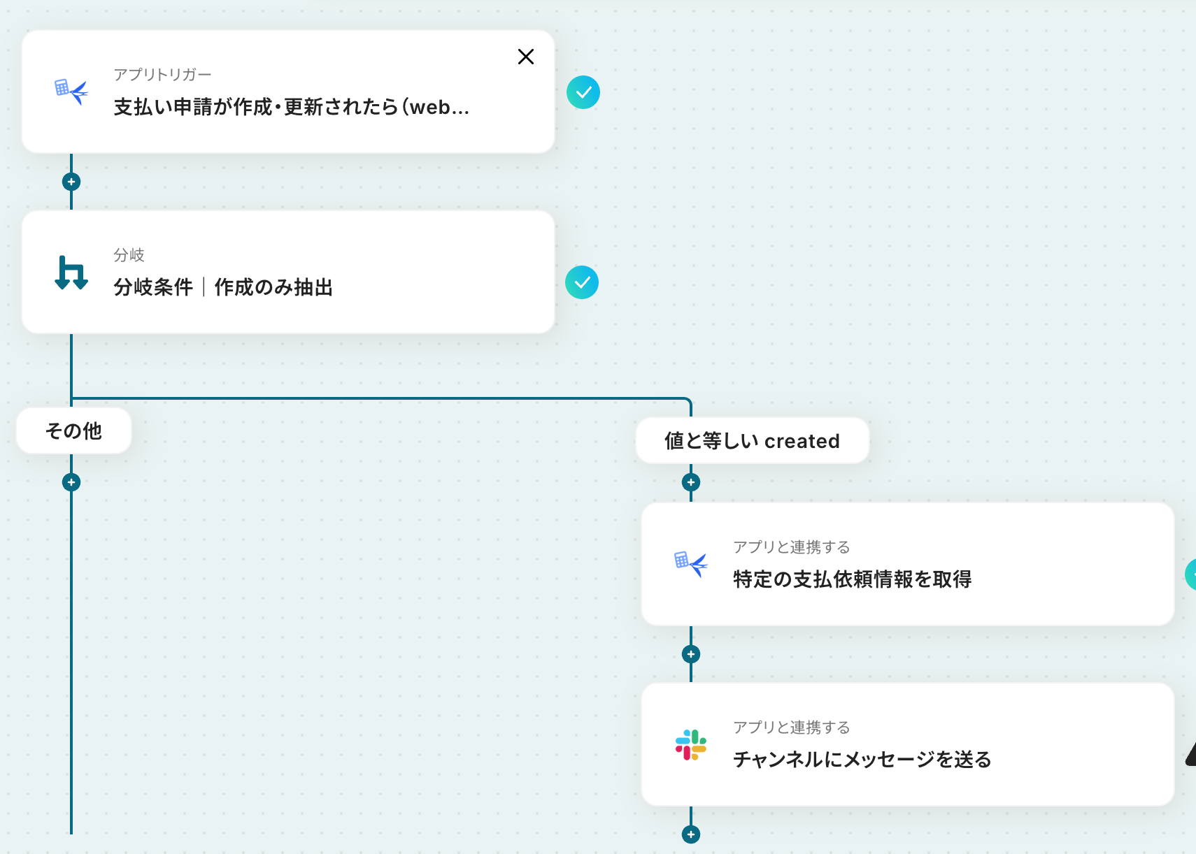 このワークフローを活用すれば、freee会計での支払い申請作成をトリガーとして、申請内容を自動でSlackに通知することが可能になり、手作業による手間やミスを解消できます。