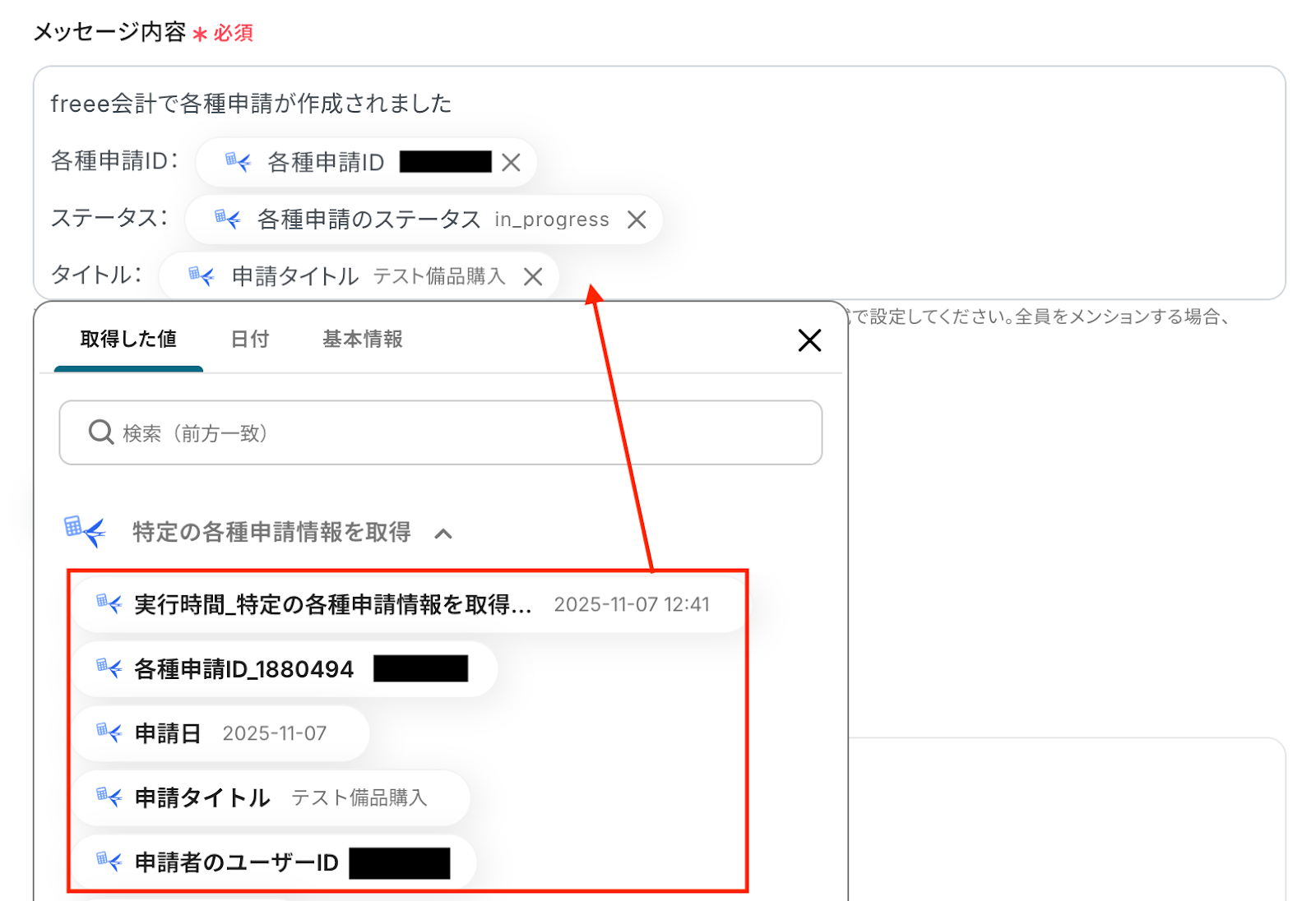 入力欄をクリックすると、トリガーのステップでfreee会計から取得した値が表示されるので、選択して入力しましょう。