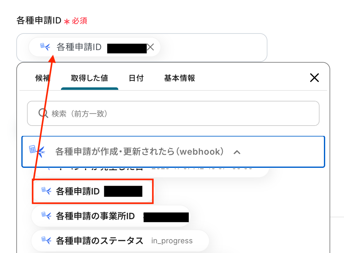 「各種申請が作成・更新されたら(webhook)」をクリックします。