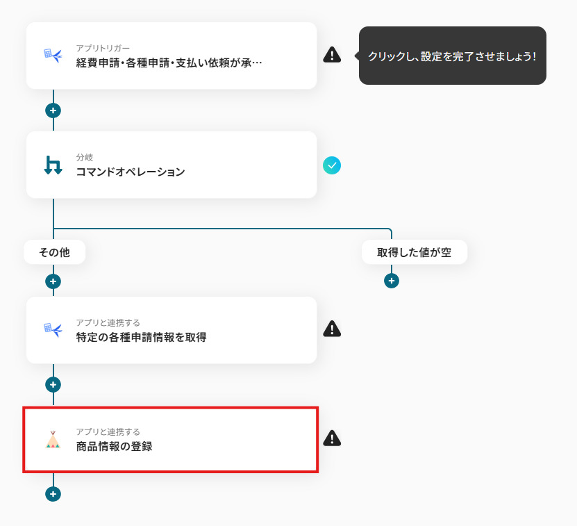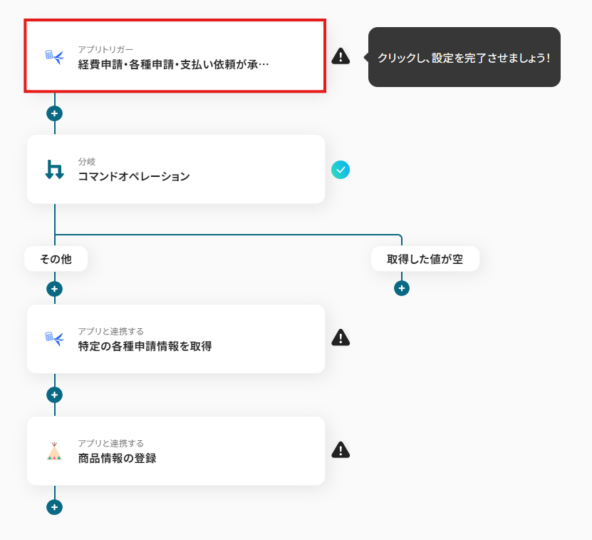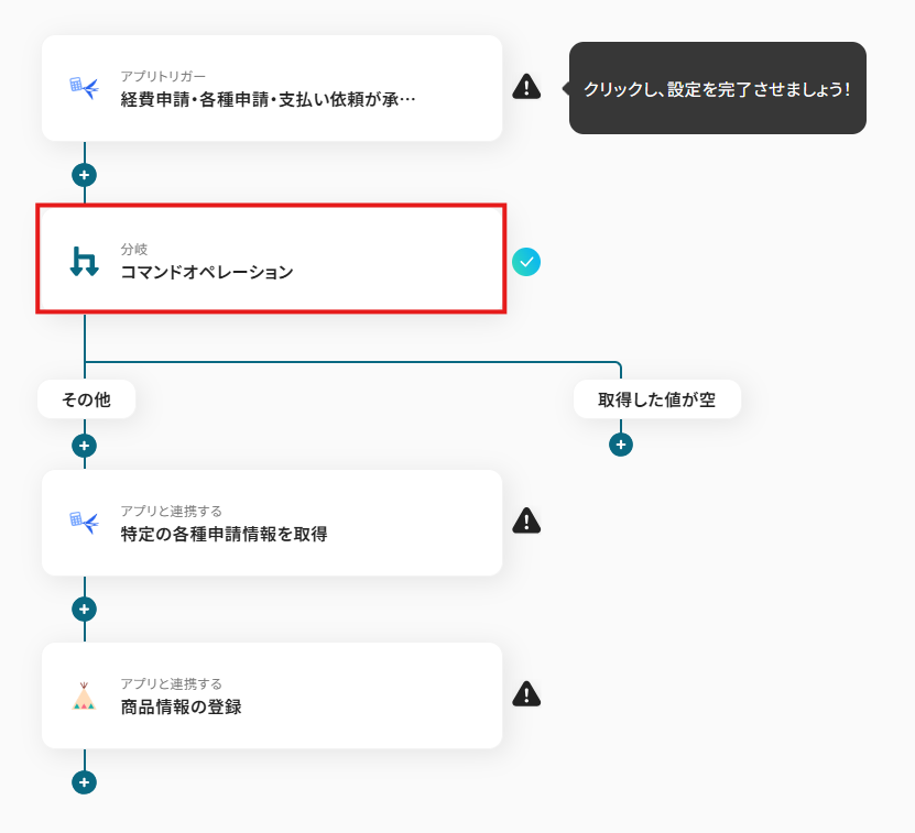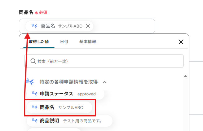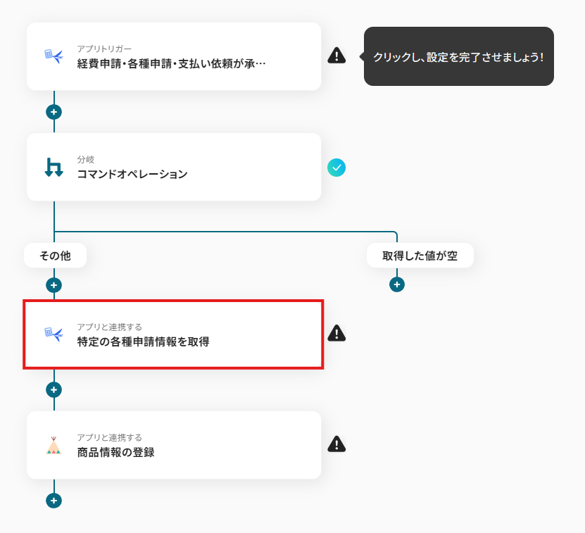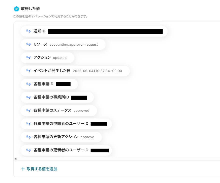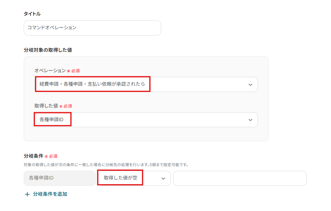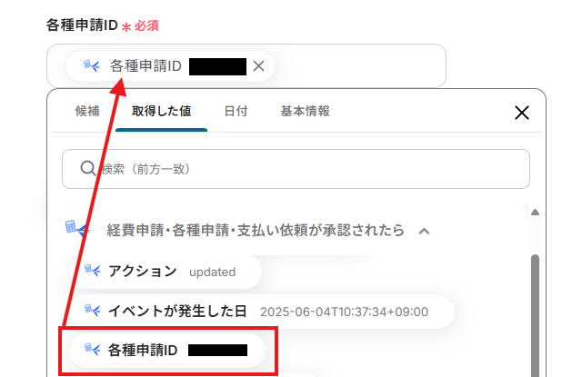 オペレーションに「経費申請・各種申請・支払い依頼が承認されたら」、取得した値に検知したい項目を設定します。