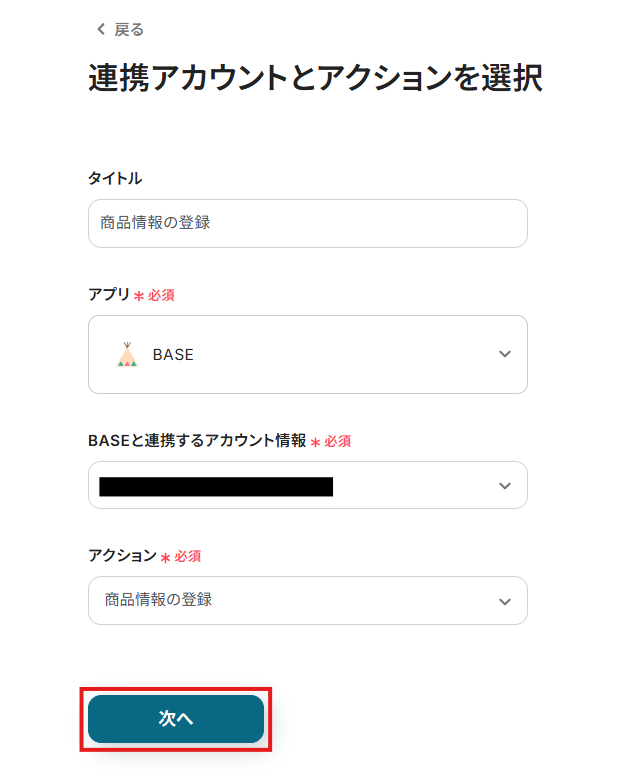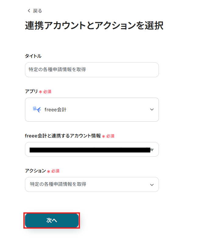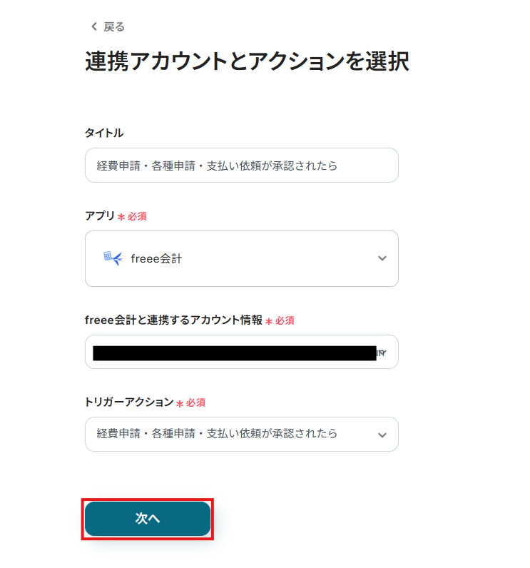 連携するアカウント情報には、ステップ1で連携したアカウント情報が反映されています。トリガーアクションはそのままにして、「次へ」をクリックしてください。