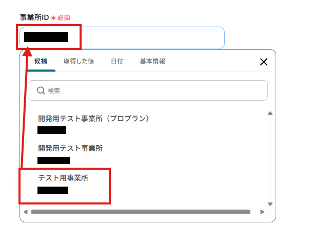 トリガーやオペレーション設定時に、「テスト」を実行して取得した値です。
