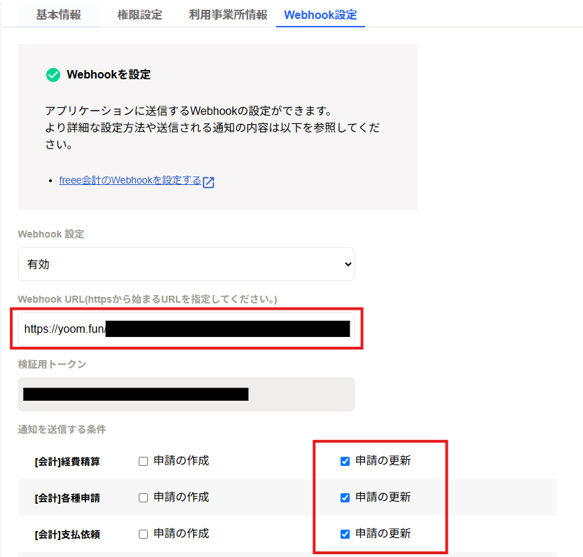 URLをコピーしたら、freee会計の画面で設定を行います。