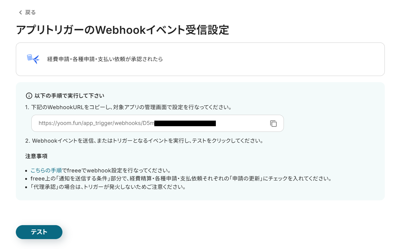 - Yoomとの連携用にfreeeアプリを作成し、Webhookを設定してください。