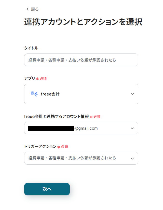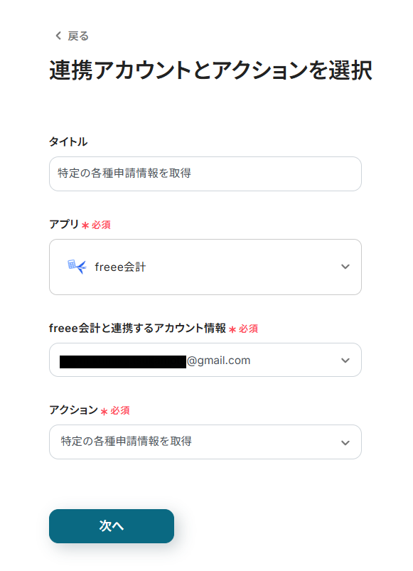 - 連携アカウントとアクションの内容を確認し、「次へ」をクリック。