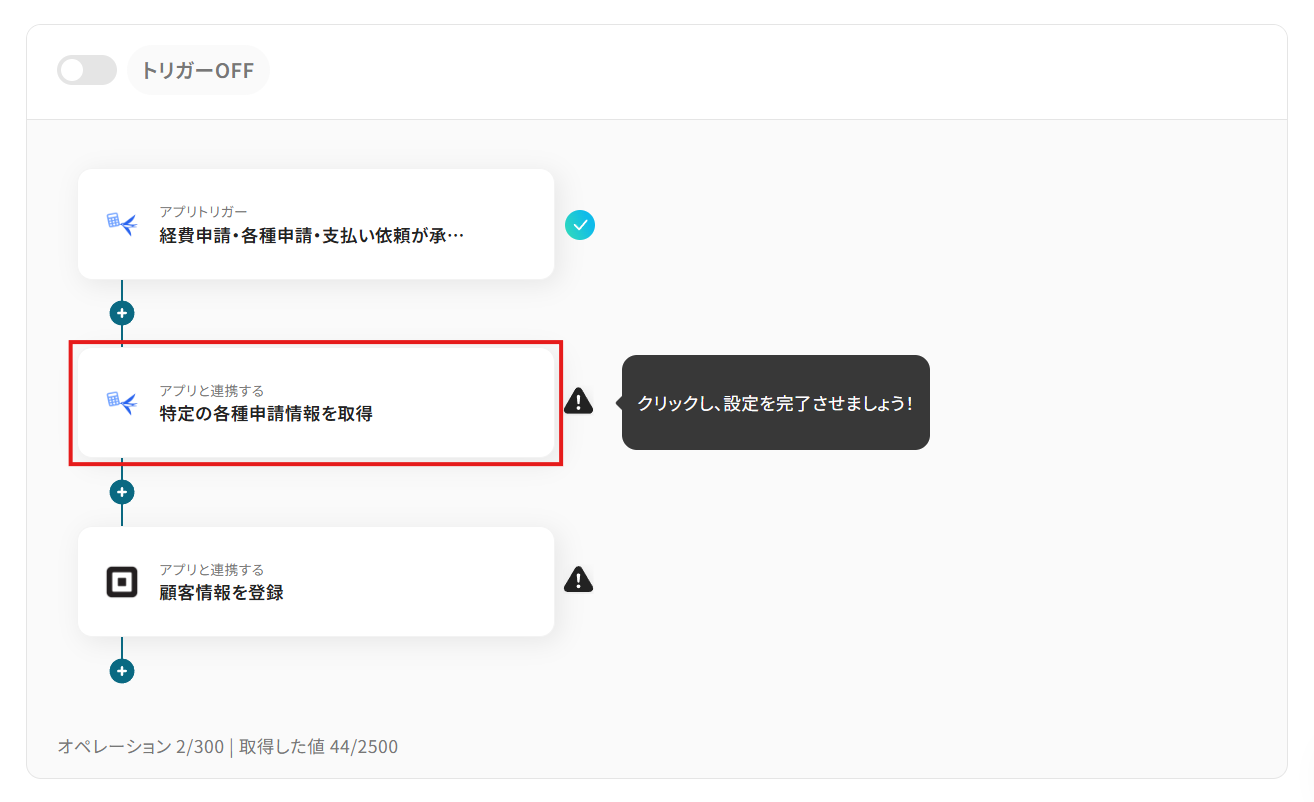 - トリガーとなるWebhookと各アクション(申請情報の取得・顧客の登録)の設定