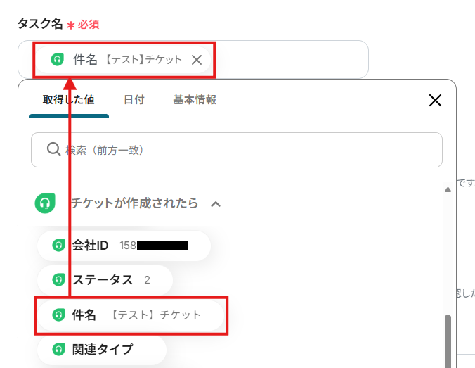 ※ 「取得した値」をスクロールすると、チケットの「件名」が確認できます。