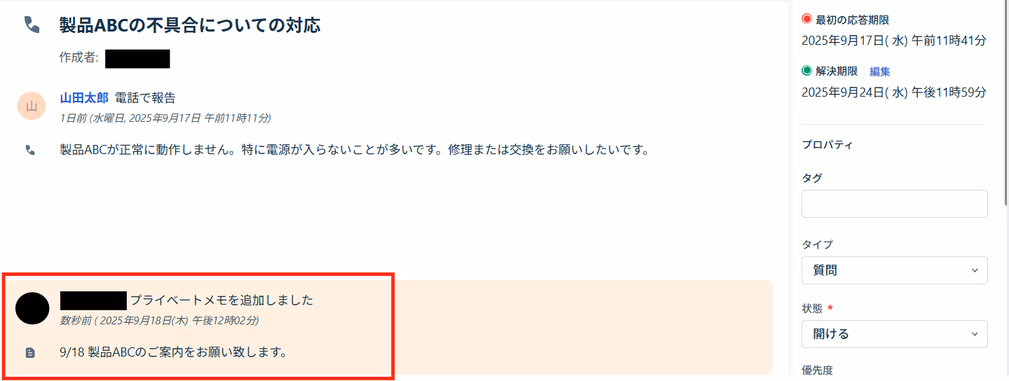 今回は、テスト用に作成済みのチケットにメモを追加しました!