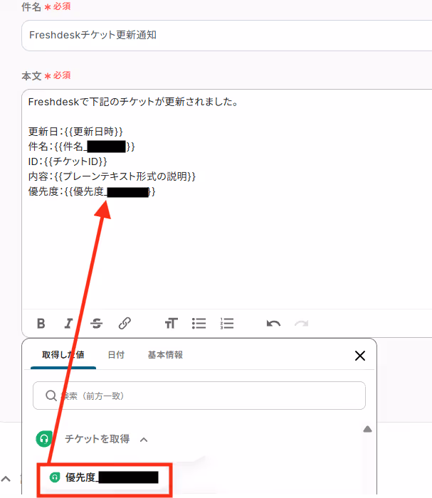 編集欄をクリックし、「「チケットが更新されたら」または「チケットを取得」からFreshdeskで更新したチケットの情報を変数として引用できます!