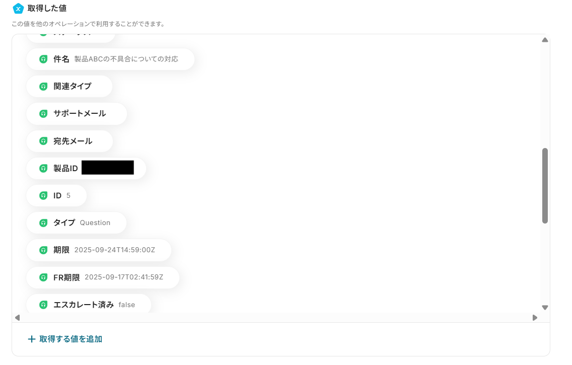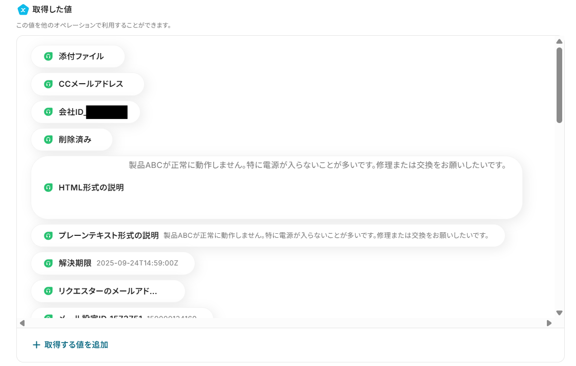 テストが成功すると、取得した値の各項目の横に、先ほどFreshdeskで更新したチケットの情報(アウトプット)が表示されます。