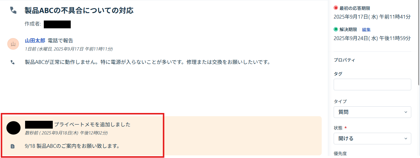 更新の内容は、ステータスの変更やメモの追加です。
