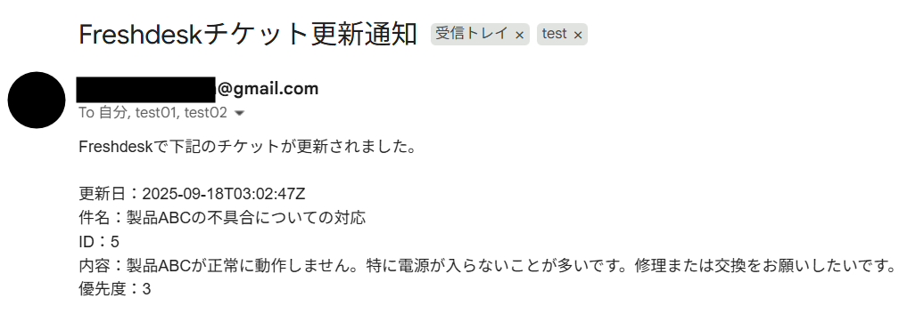 Freshdeskでチケットのステータス更新やコメント追加が行われた際に、その内容をGmailで自動的に通知します。