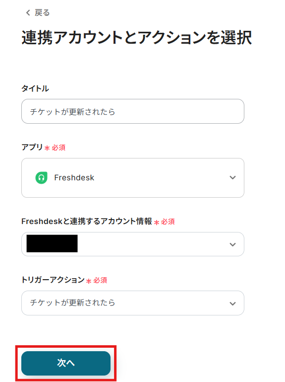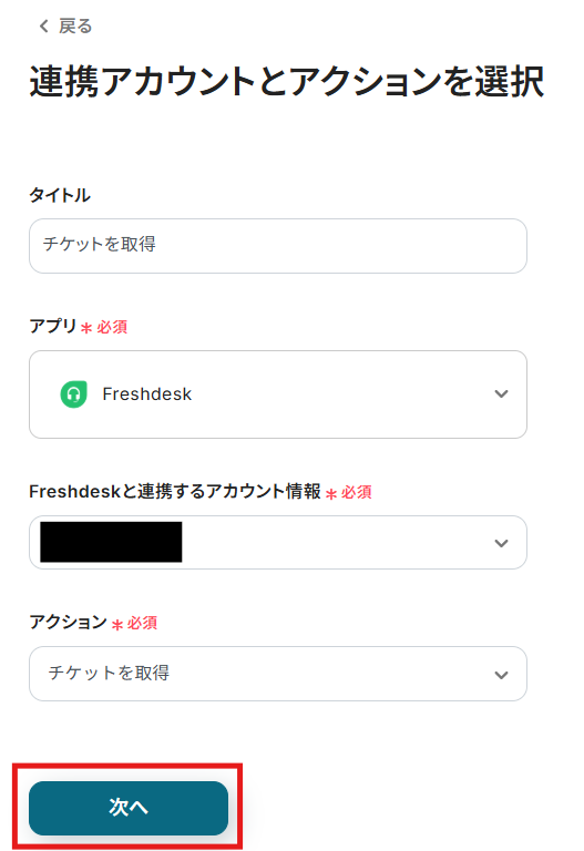 アカウント情報の項目にはステップ1でマイアプリ連携したFreshdeskのアカウント情報が自動で表示されます。