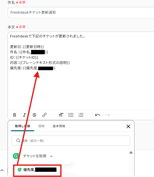 A:Freshdeskで更新されたチケットのID・タイトル・内容・ステータスなど動的な情報を、通知の本文に差し込むことができます!