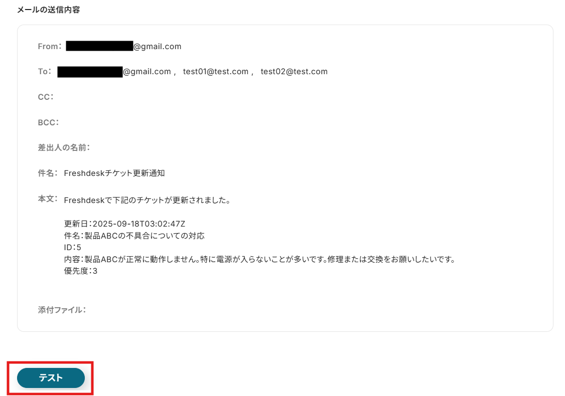 最後に、Freshdeskでチケットが更新されたことをGmailで通知する設定を行います。