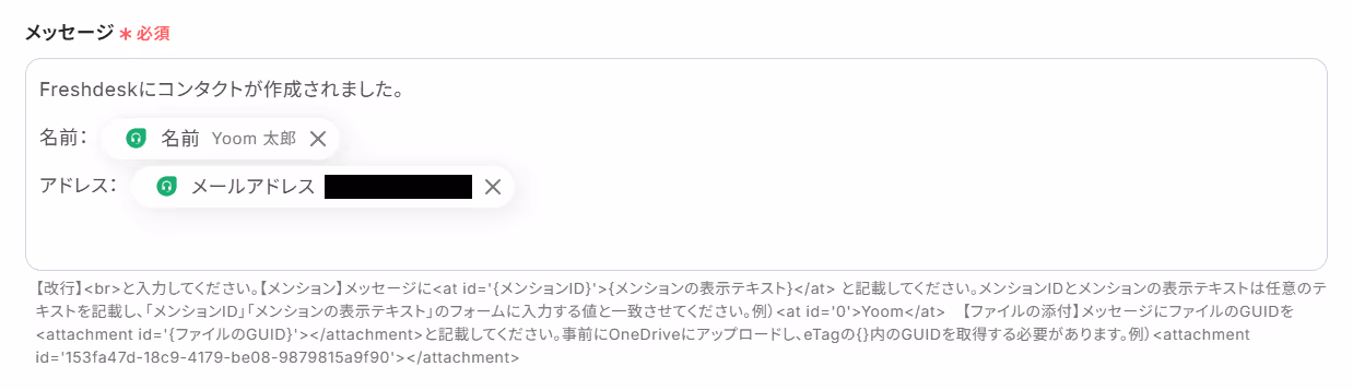 メッセージの設定でメンションを使用したい場合は、メッセージ下部にある注釈を確認し、メンションID、メンションの表示テキストそれぞれメッセージで使用したものと同じ値を入力してください。
