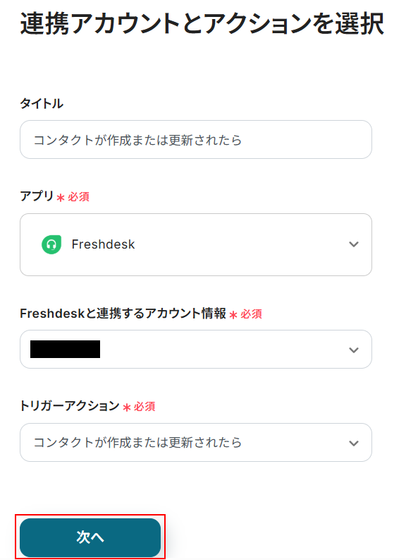 Freshdeskと連携するアカウント情報を確認し、問題なければ「次へ」をクリックします。