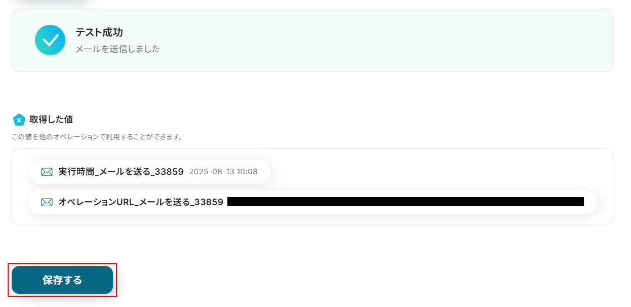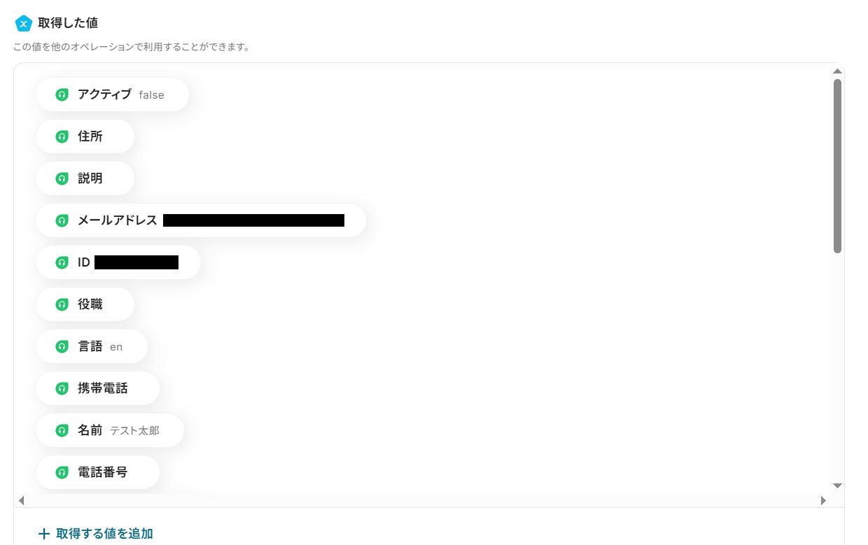 テストに成功するとテスト成功画面が表示され、下記のように取得した値(アウトプット)が表示されます。
