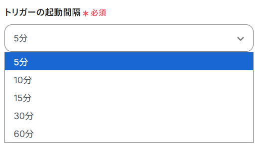 - トリガーの起動タイミングは、5分、10分、15分、30分、60分のいずれかで設定できます。
