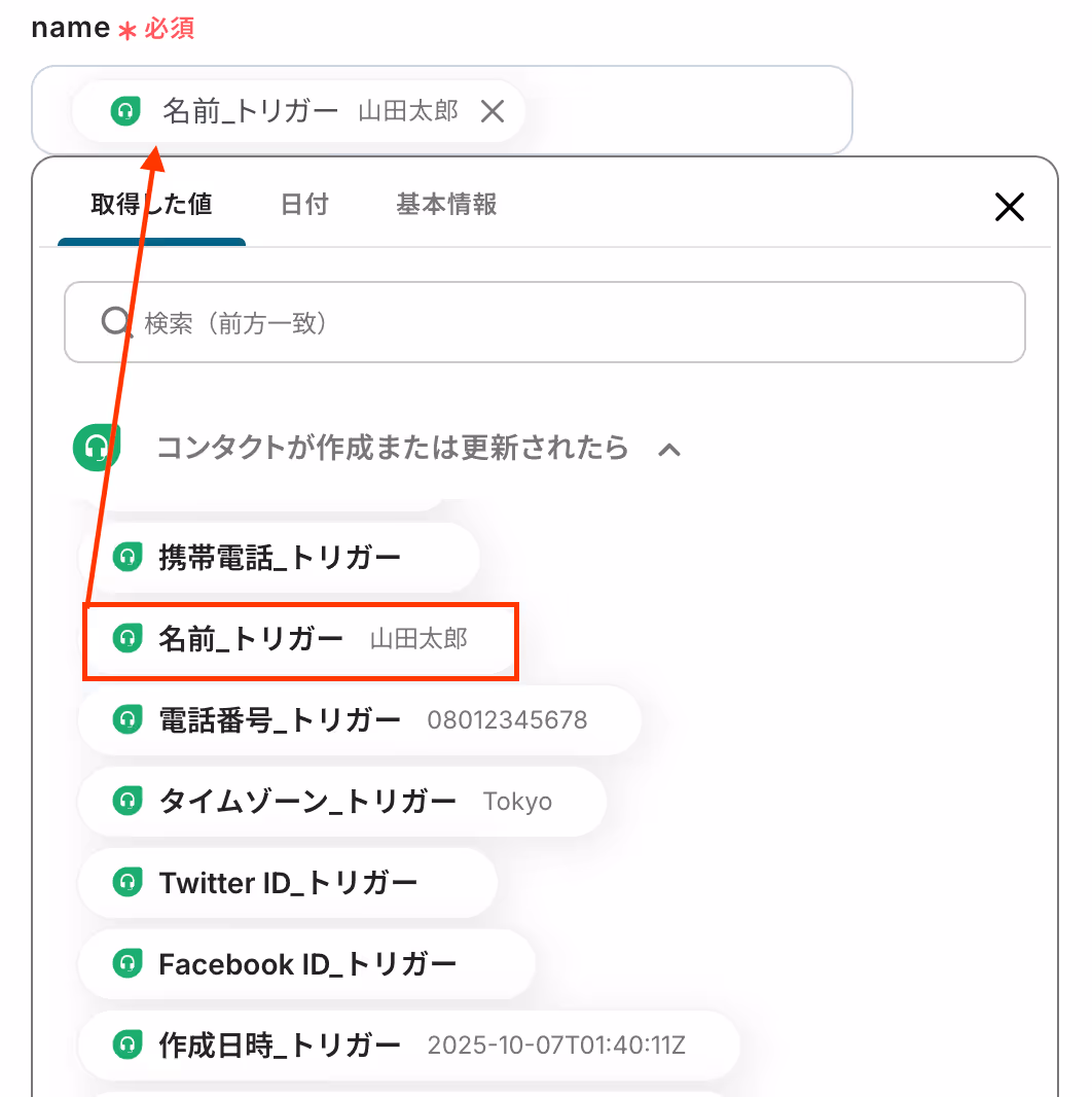こちらもnameと同様に、入力欄をクリックすると取得した値が表示されるので選択して入力が可能です。