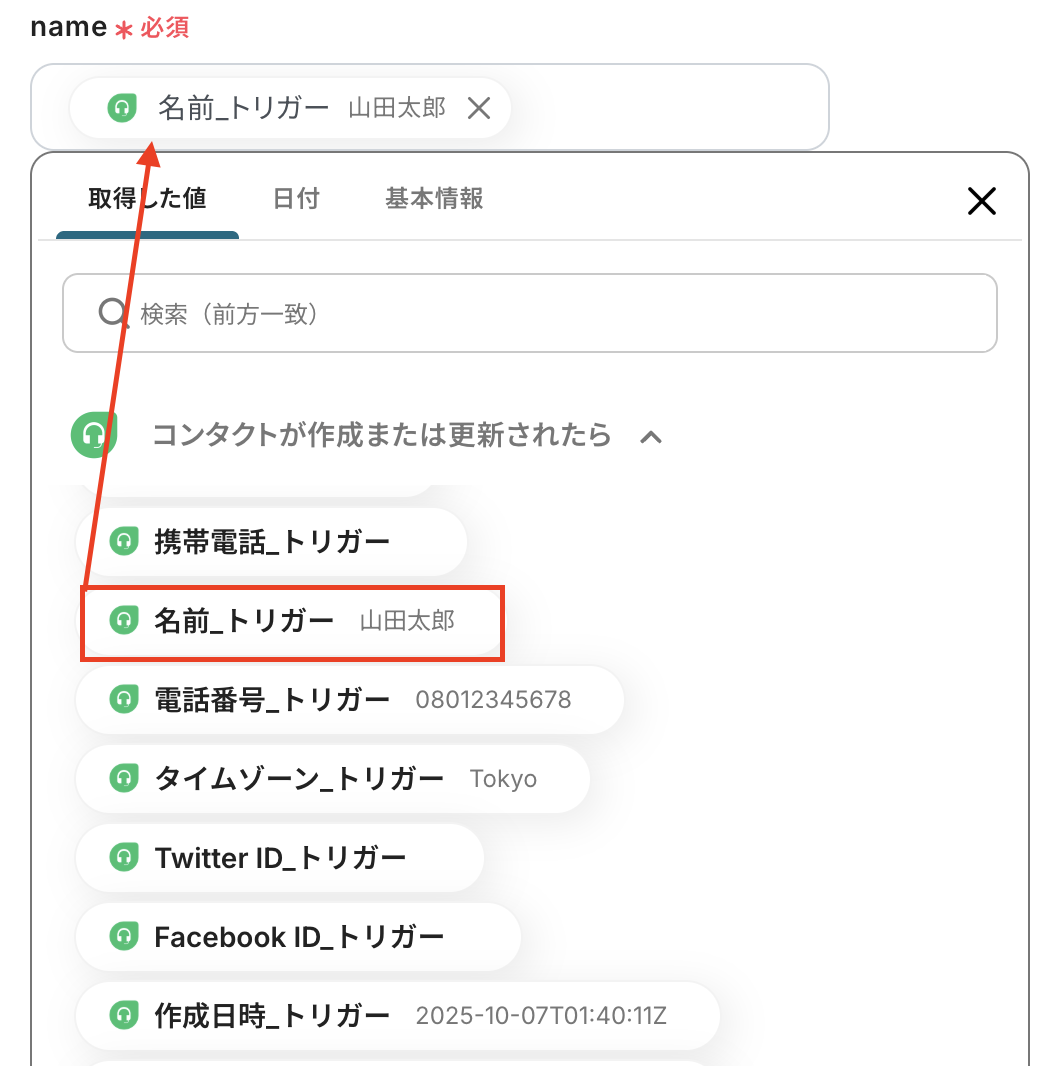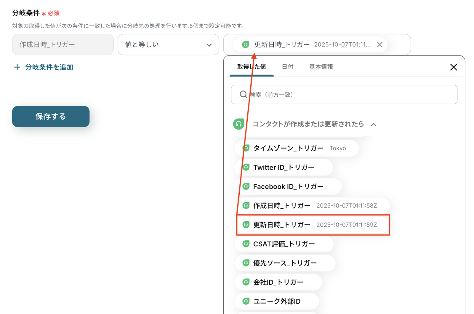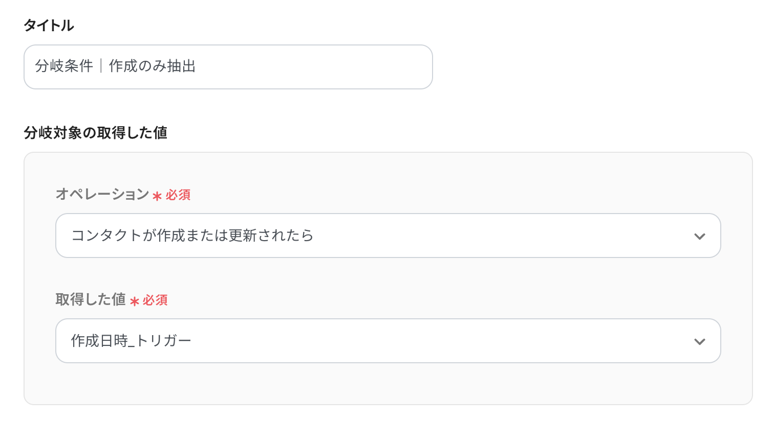取得した値 デフォルトで「作成日時_トリガー」が選択されています。 新たに顧客が作成された日時を基準に処理を分ける設定です。