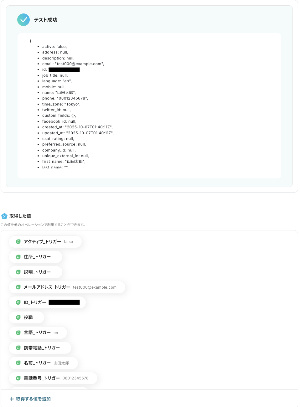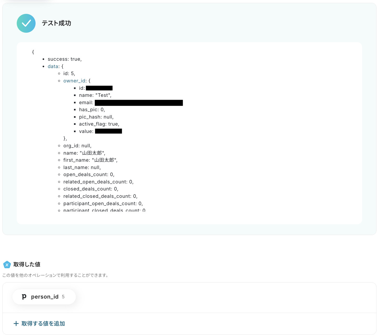 テストに成功すると、Freshdeskに作成されたコンタクトに関する情報が一覧で表示されます。 以下の画像の取得した値を利用して、Pipedriveで人物の追加が可能です。