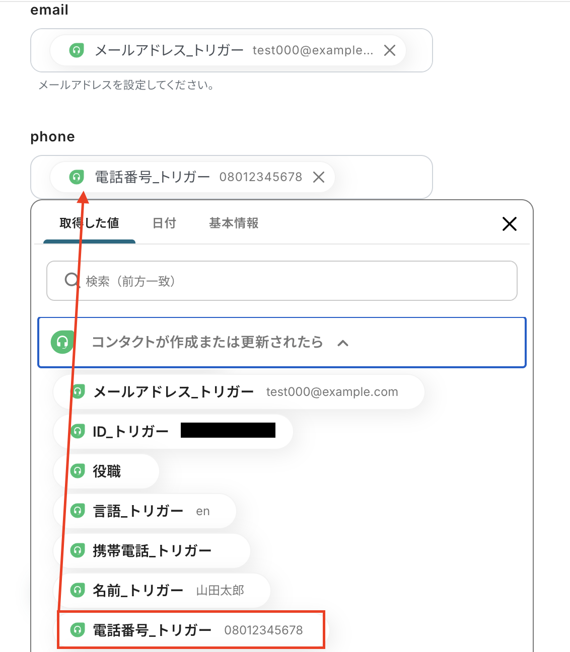 email phone こちらもnameと同様に、入力欄をクリックすると取得した値が表示されるので選択して入力が可能です。