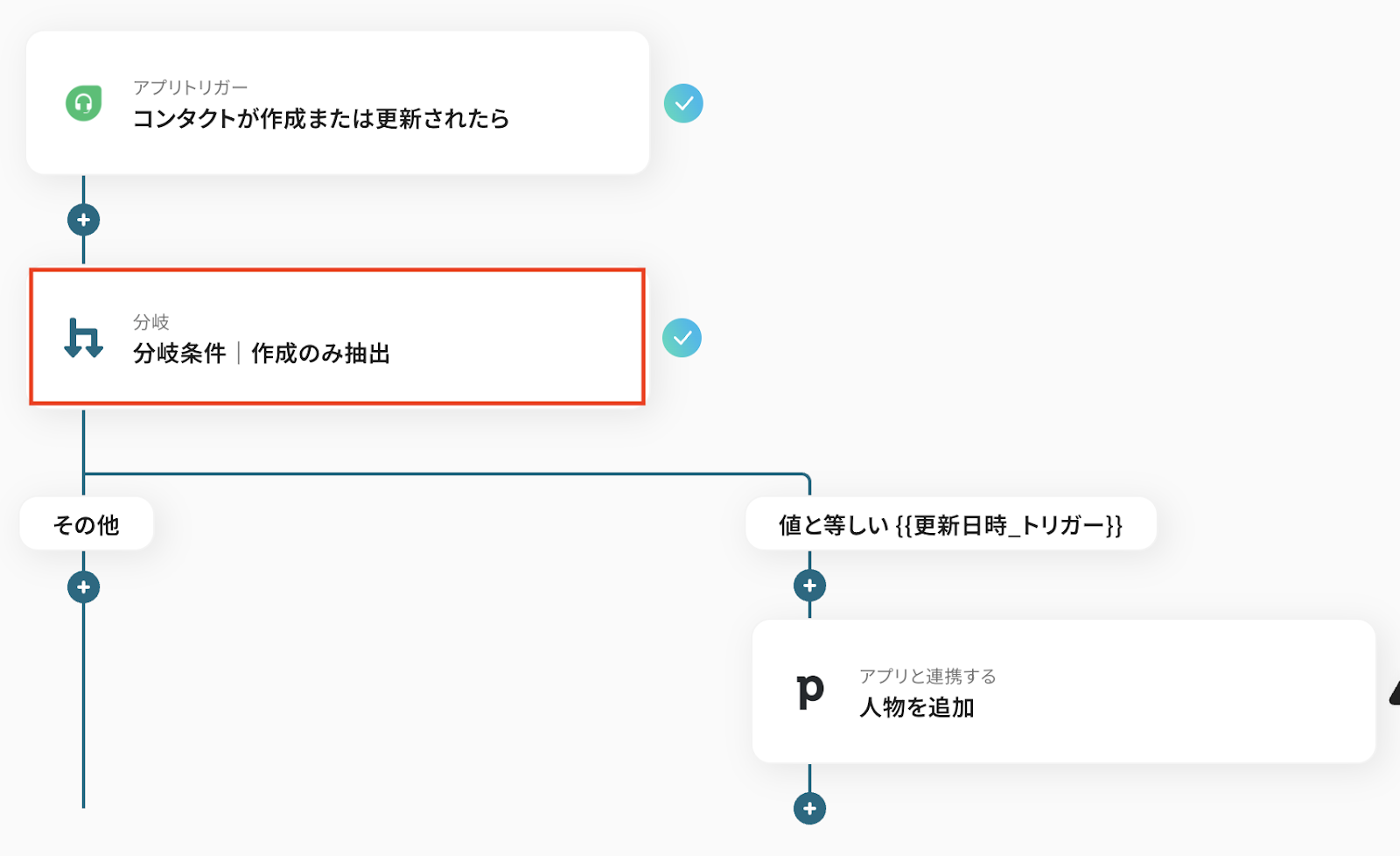 Freshdeskで新しいコンタクトが作成された場合にのみ処理を行うよう、分岐条件を設定します。