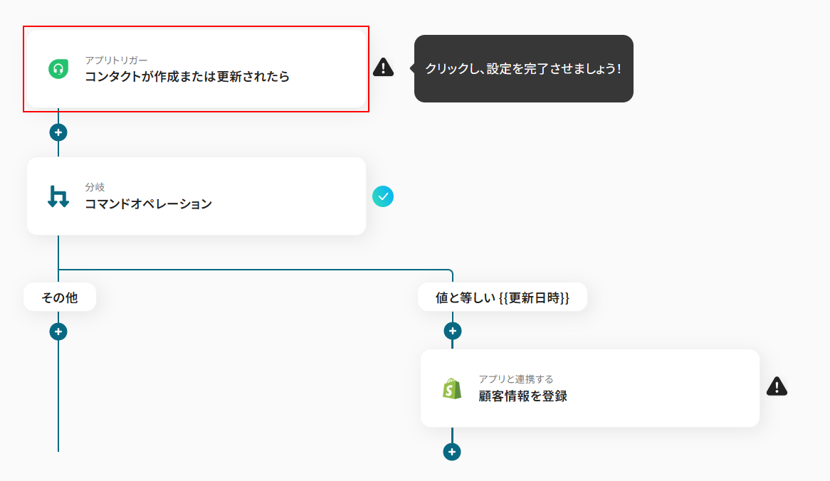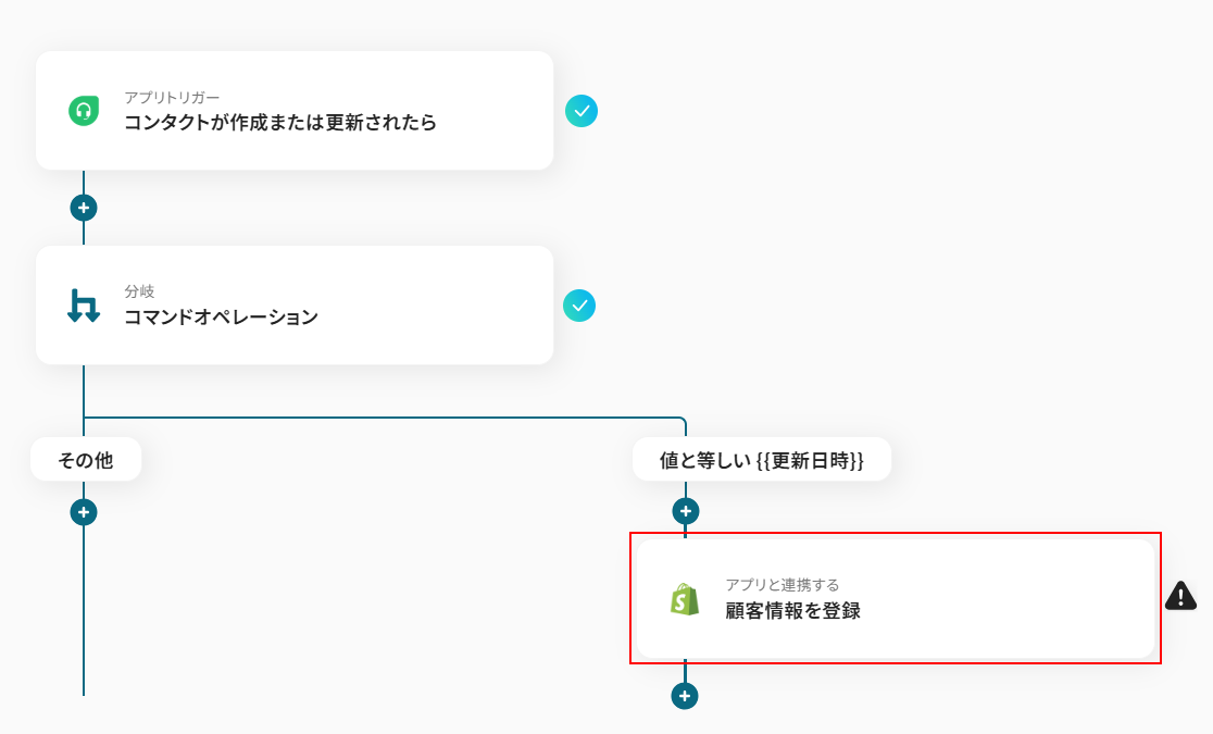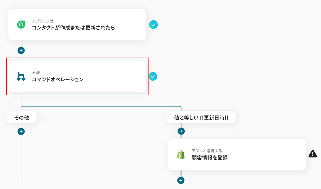 分岐コマンドオペレーションで作成日時と更新日時を比較し、コンタクトが新規作成された場合は顧客情報を登録する、コンタクトが更新された場合は何も処理をしないといった処理を行います。