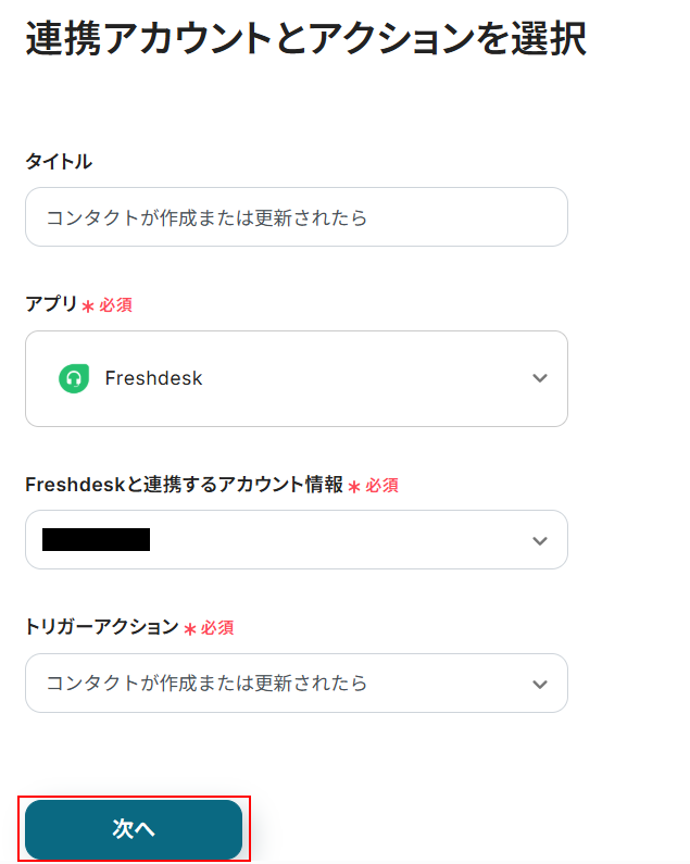 Freshdeskと連携するアカウント情報を確認し、問題なければ「次へ」をクリックしてください。